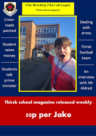 What I like about my magazine is how it's very personalized. It uses images of the students that doesn't look like they are forced into doing it, their expressions are natural and believable. I think the colour scheme works very well here, it represents the school and is a nice combination on the magazine. I specifically picked a darker shade for the red and blue as not only is that the Thirsk colours but because it would be too bright and ugly if I used light blue and red, the yellow being light is good because I haven't used that colour as much so it gives the whole thing a nice accent not being completely dark.